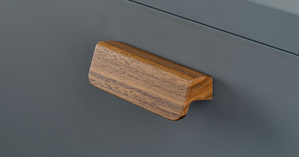 It’s an extremely practical, ergonomic handle. The wood which is currently trending in the world of interior design, gives it a feeling of extraordinary warmth and the fusion of straight lines and rounded edges make Flapp a very pleasant accessory which emits a sensation of elegance and fits naturally into any environment. The 1100 mm long format sets it apart as a unique handle on the market with unlimited decorative possibilities. It manages to enhance the exclusivity of each space when fitted to cupboards and wardrobes with large dimensions. The oak and walnut finishes relate really well to currently fashionable colours for furniture making for a really interesting contrast. We should also make a special mention for the feeling of peace and well-being that the walnut finish transmits when combined with melamine in a forest green tone.