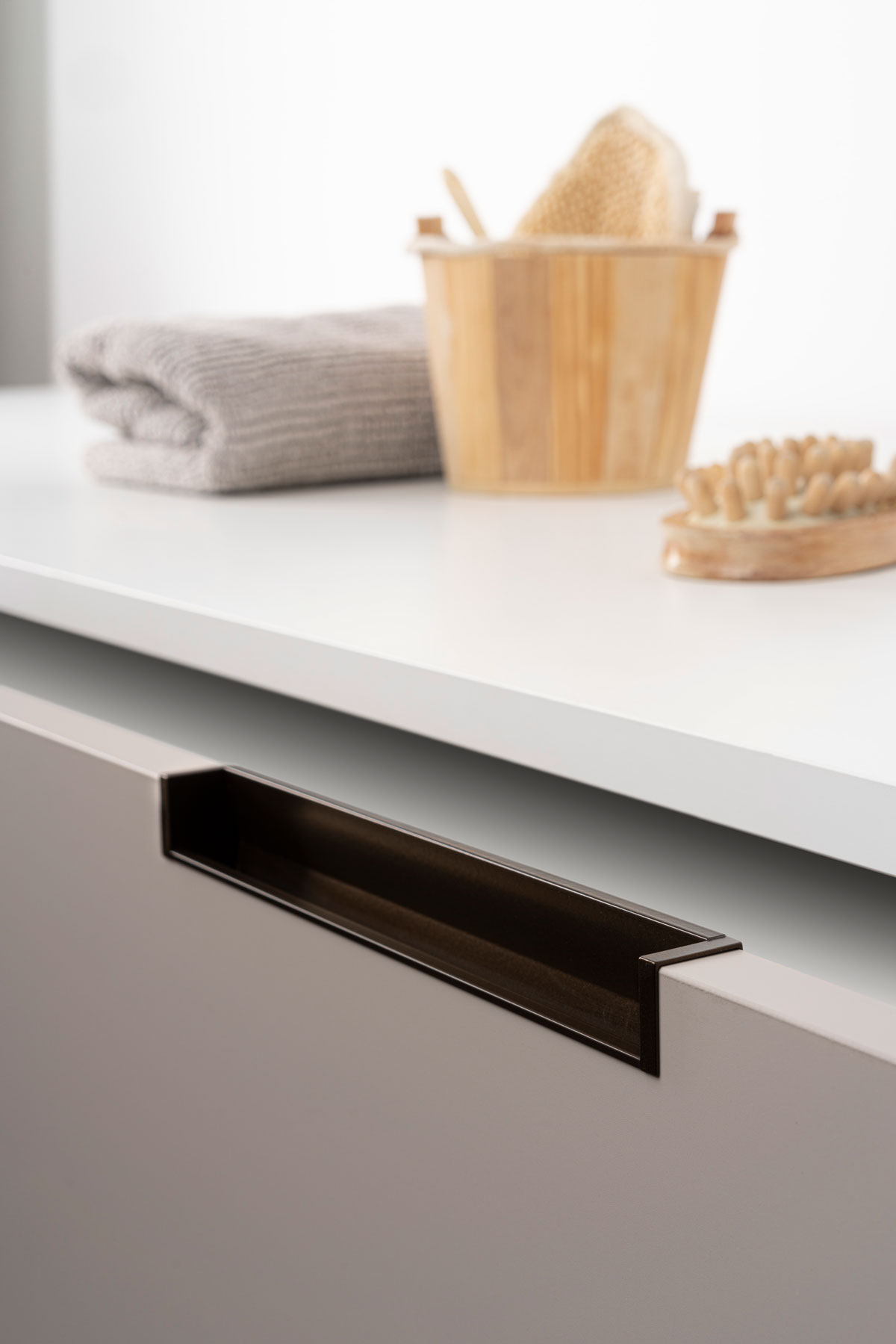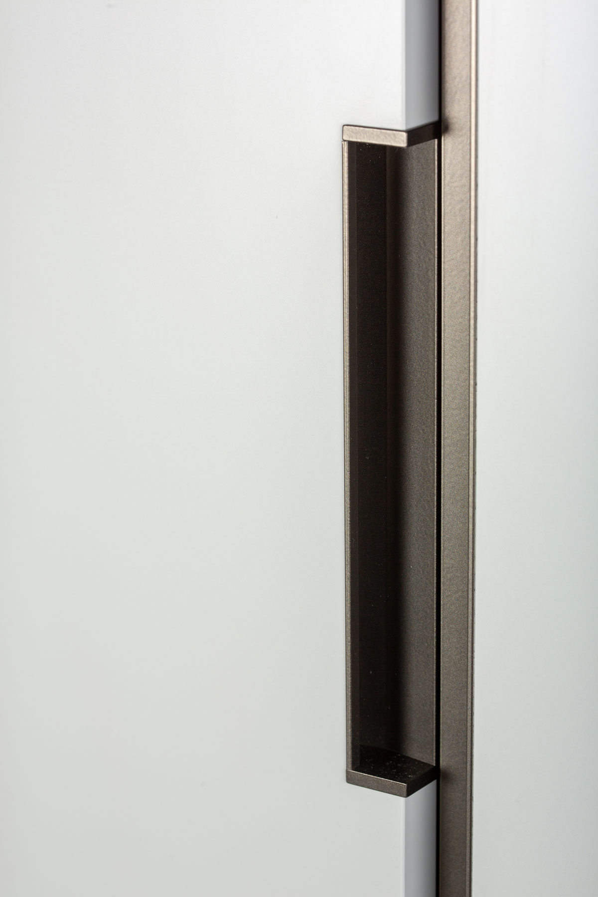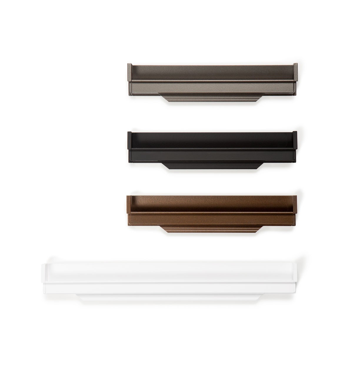 Hexxa is a handle with an aluminum built-in profile with an innovative design, different to all the models manufactured at Viefe® until now. Its two sides have a small incline which gives it a visual effect that is both modern and elegant. The singular characteristic of this model is that it allows you to play with a combination of sizes, as one of the doors can have a longer handle than the other so as to emphasize its fashionable features. It is a handle that can adapt to any size of door measurement that you wish, it is fitted without any complication and means the door can be opened and closed in a really comfortable way. It is available in matt white, matt black, metallic grey and metallic brown. It has been created especially to be fitted to kitchen cupboards and drawers.