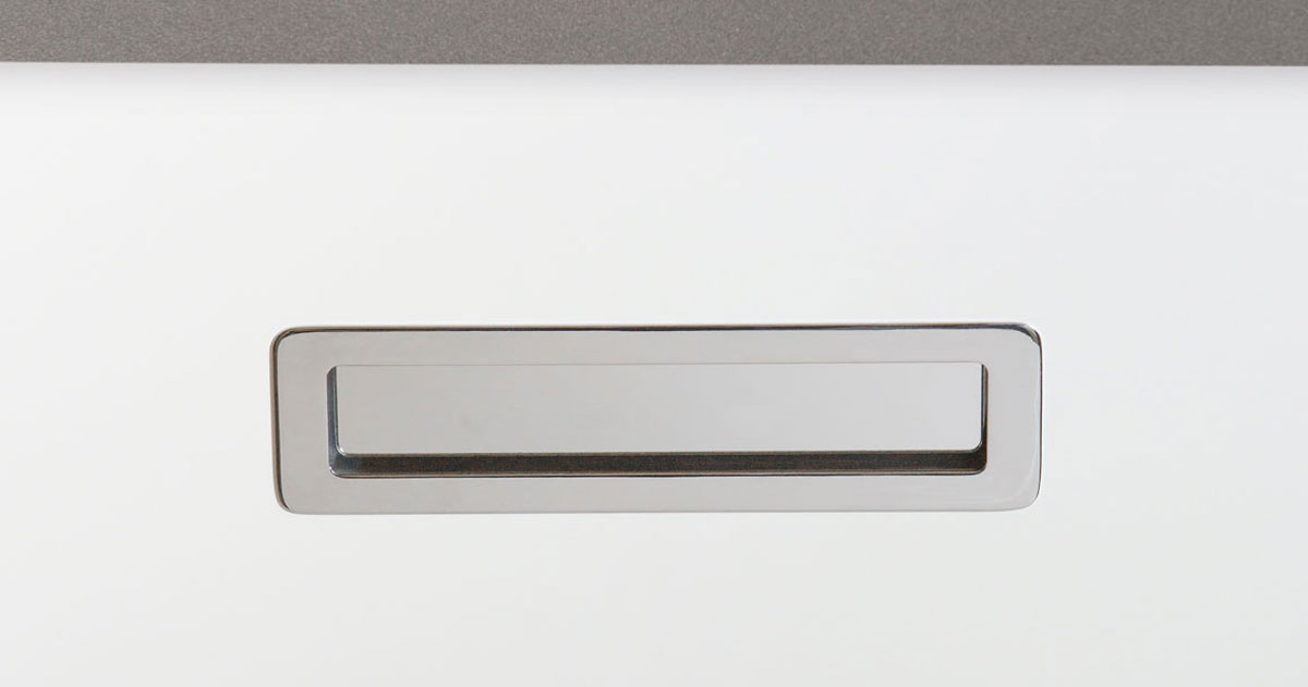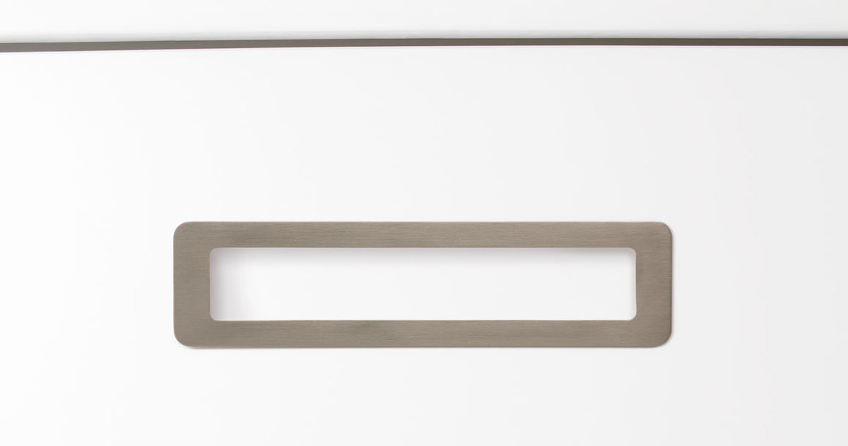 The built-in handle Low ST with its rectangular shape and rounded edges can be inserted into kitchen and bathroom furniture in an organic way. It becomes simply like another part of the furniture, it adjusts perfectly and it is easy to install. It is manufactured in zamak and comes in shiny chrome and brushed nickel. Its 2 sizes can be complemented with a white cover that is located inside and allows a totally harmonic integration in white furniture.