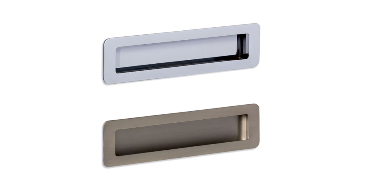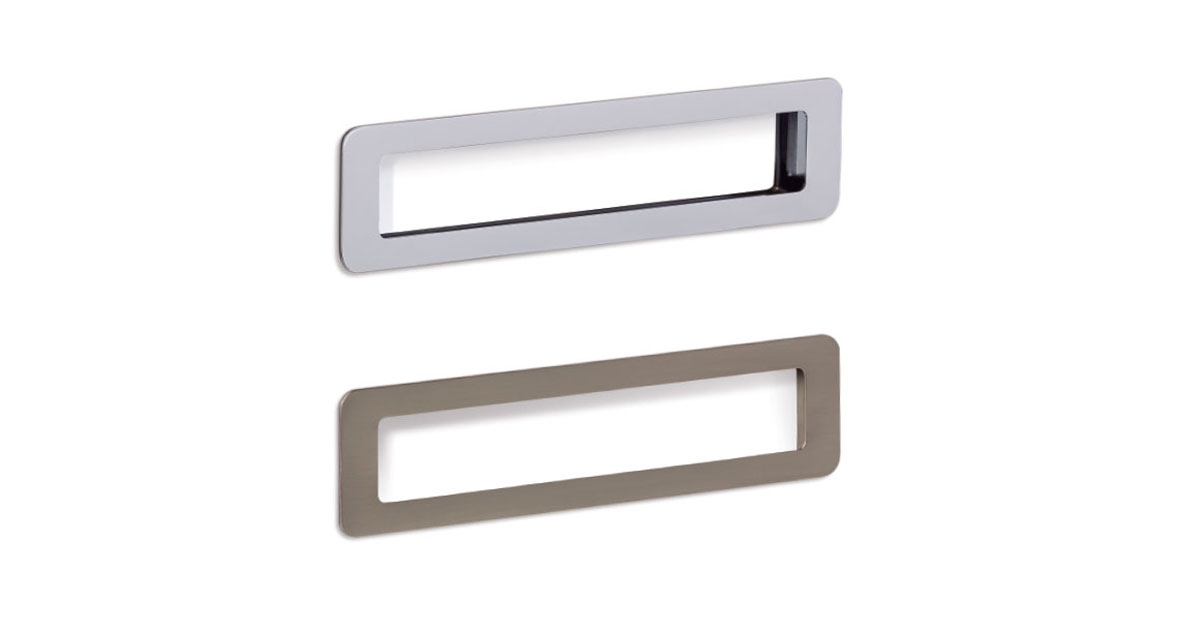 The built-in handle Low with its rectangular shape and rounded edges does not have a rear cover. It can be inserted into kitchen and bathroom furniture in an organic way. It becomes simply like another part of the furniture, it adjusts perfectly and it is easy to install. It is manufactured in zamak and comes in shiny chrome and brushed nickel.