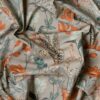 The pattern consists of beautifully drawn floral and vegetable motifs in balanced shades of grey, green, yellow and blue, the pink being the color accent that gives an extra personality to the fabric.