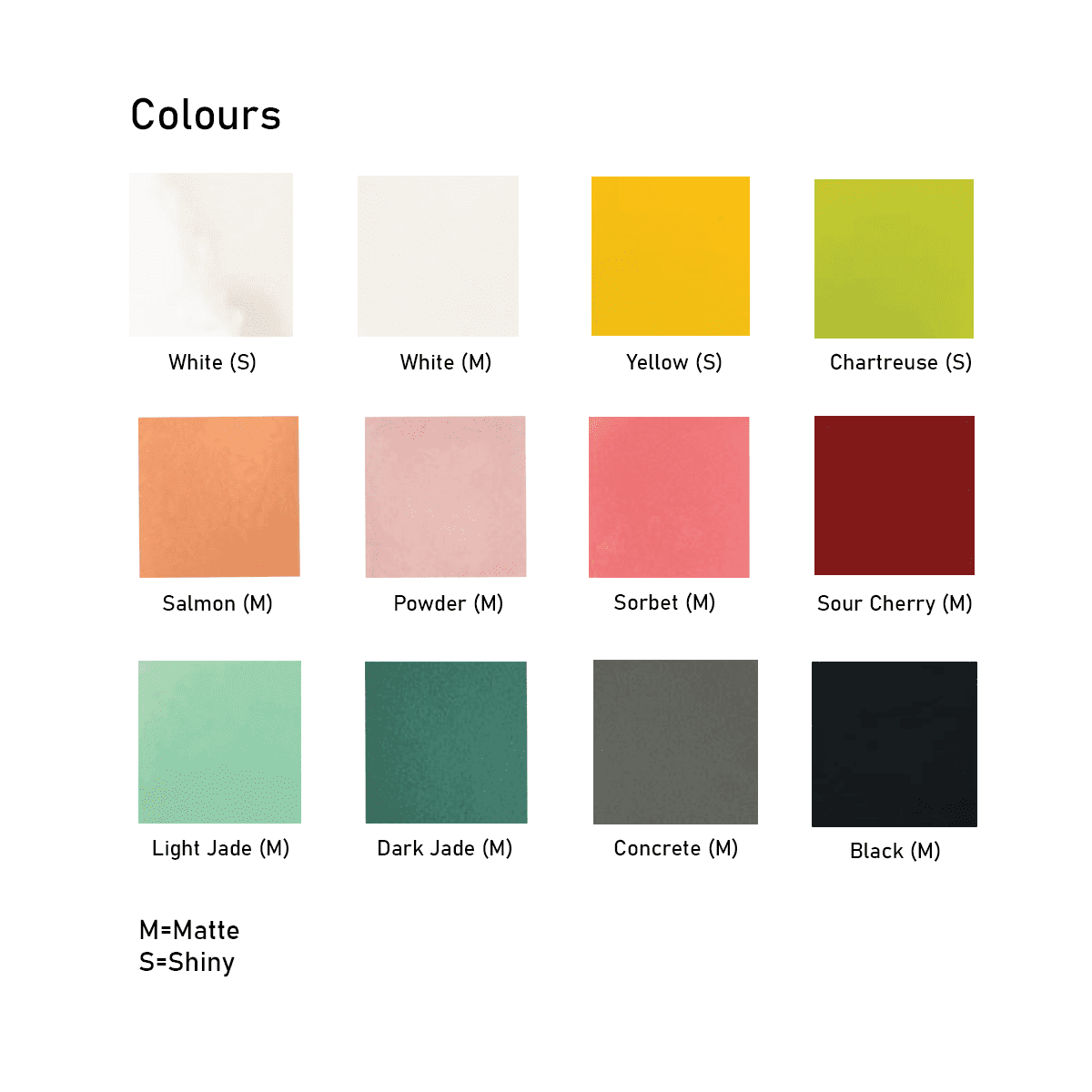 | Porcelain colors | Straciatella, Crumb, Grained Ochre, Limestone Beige, Moss, Olive Green, Seashell Green, Granite, Burgundy, Transylvanian Blue, Steel Blue, Grained Black |
