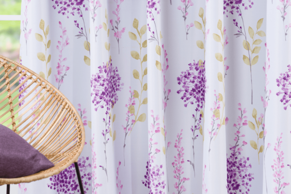 The Tahiti decor is made of a dense dimout fabric with a high degree of opacity. Tahiti features a floral print in bold shades of purple and blue.